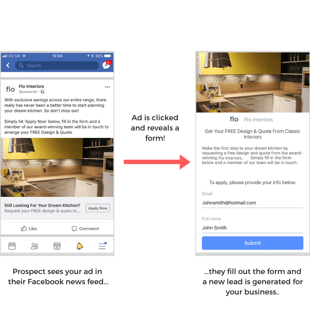 Step 6: The type of advert we’ve set up is called a ‘Lead Ad’. This type of ad works by the person clicking on it and then submitting their data via a pre-filled form (below right). This data then automatically goes into a list for you to download at a later date.