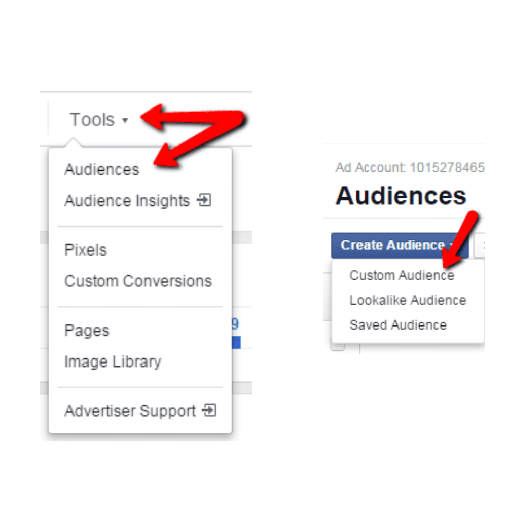 Step 1: First, you’re going to need to put a ‘Pixel’ on to all pages of your website and any other landing pages you use. Log into your Facebook Ads Manager account and select the “Tools” dropdown and select “Audiences.” Then select “Create Audience” and “Custom Audience.”