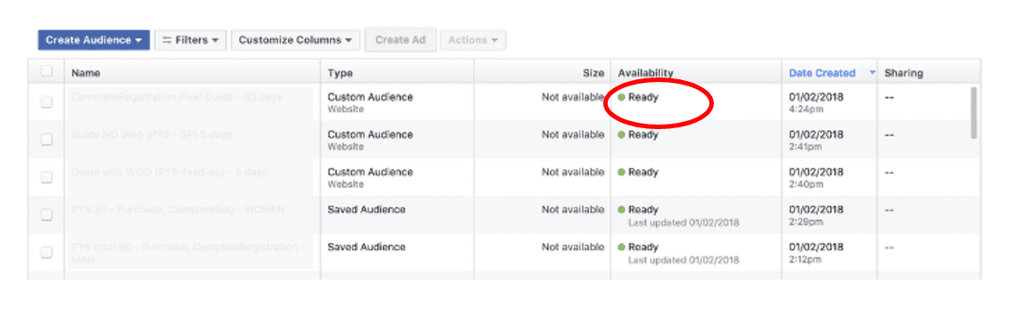 Step 4: Once your audience is larger enough, it’s time to set up your adverts (remarketing audiences need to include at least 20 people before they can be used for ads- this may take minutes, hours or a few days depending on how many visitors your site gets). You’ll know when an audience is large enough when it has a green light and ‘ready’ next to it in the Audiences section of Ads Manager (see below).